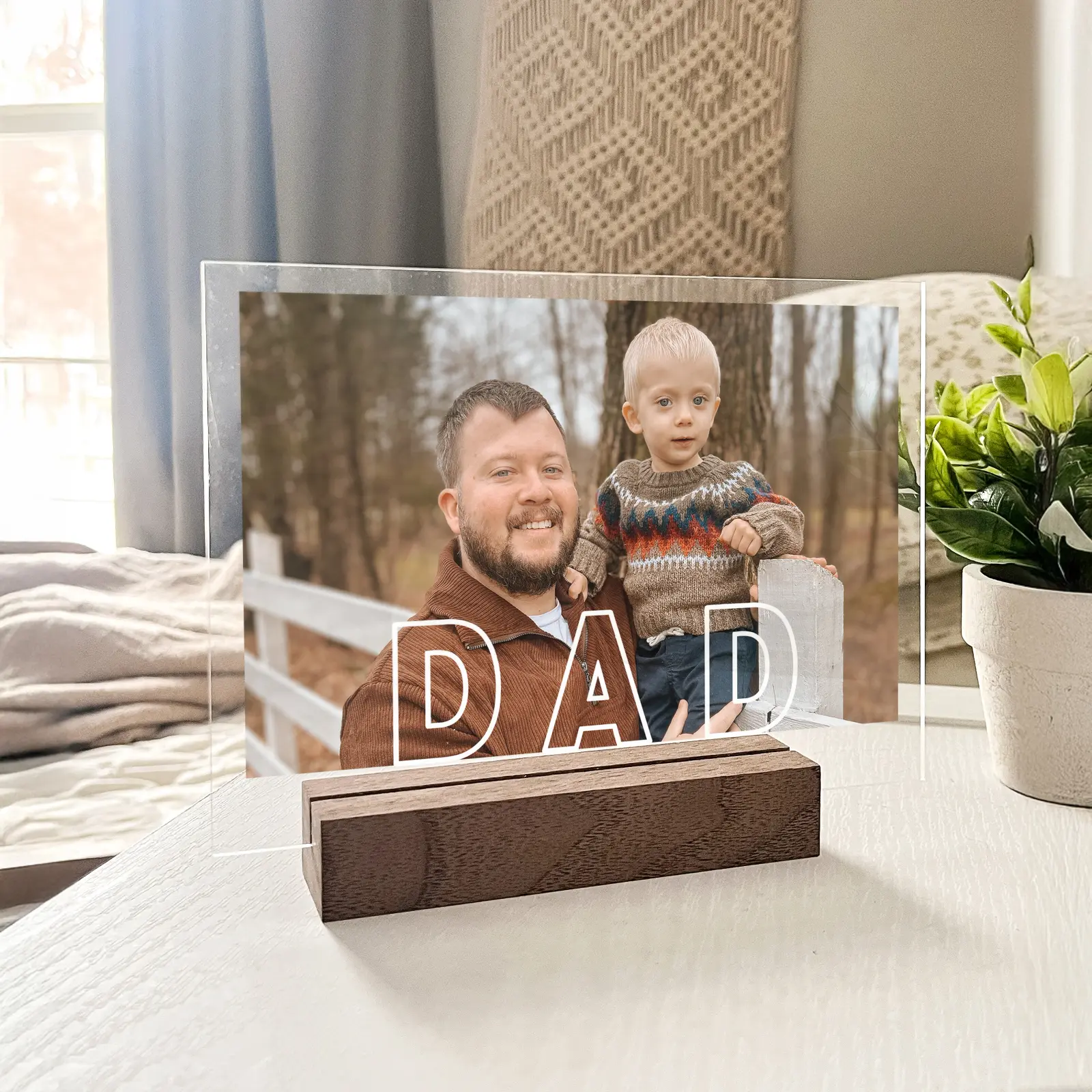 Display your cherished memories with this beautiful acrylic photo plaque. This freestanding display features a clear acrylic panel that makes your photo stand out with a modern, three-dimensional effect.