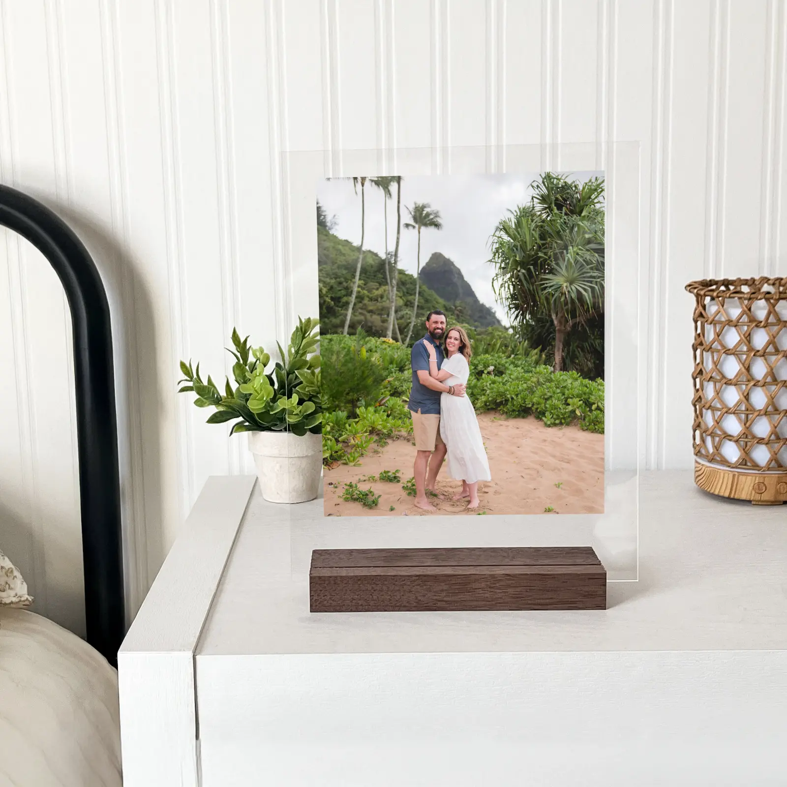 The plaque is designed to hold your favorite vertical photo and includes a space for custom text, such as a special date, a name, or a meaningful message. It sits securely in a handcrafted black walnut base, adding a touch of natural warmth to the sleek acrylic.