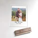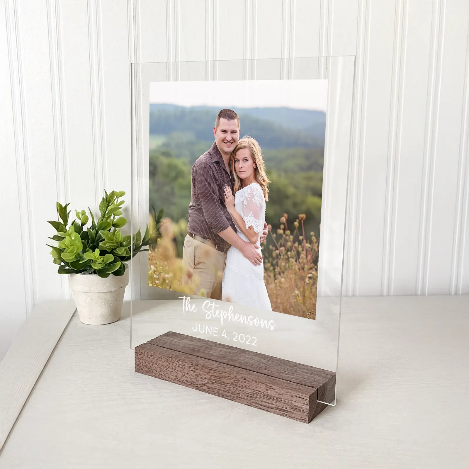 The plaque is designed to hold your favorite vertical photo and includes a space for custom text, such as a special date, a name, or a meaningful message. It sits securely in a handcrafted black walnut base, adding a touch of natural warmth to the sleek acrylic.