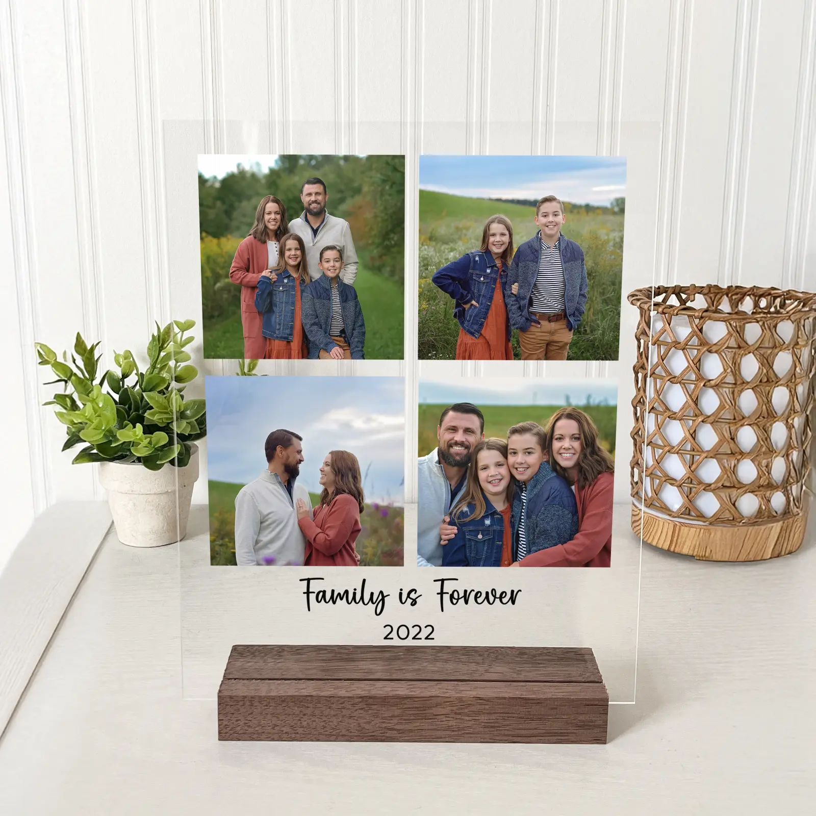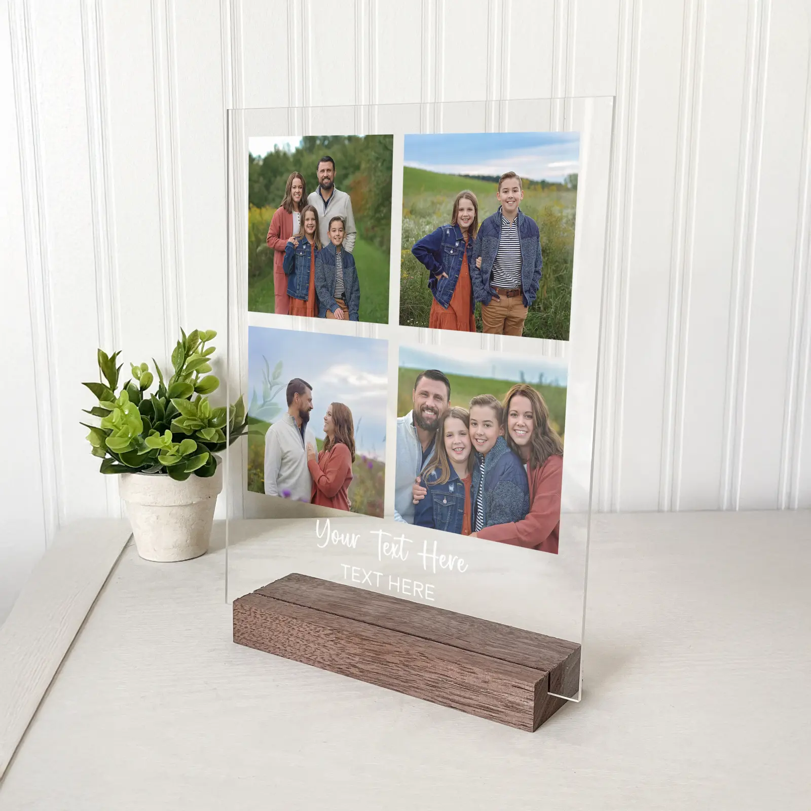 The plaque is designed to hold your favorite vertical photo and includes a space for custom text, such as a special date, a name, or a meaningful message. It sits securely in a handcrafted black walnut base, adding a touch of natural warmth to the sleek acrylic.